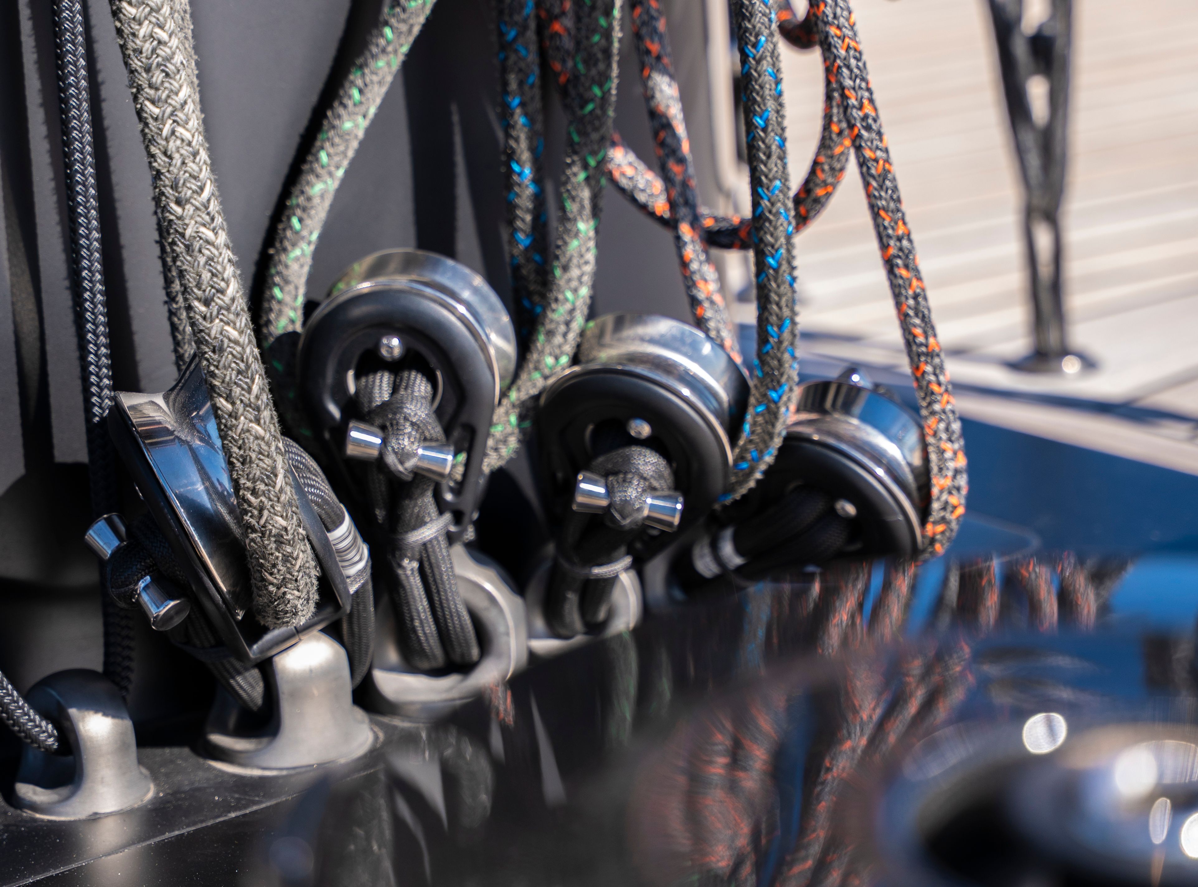 The project presented technical challenges, particularly around tight fairleads and load paths for systems such as the jib up/down, in/out and main traveller. These were solved through the use of multi-lap strops, ensuring both smooth operation and the required safety factors under the latest RINA classification rules.